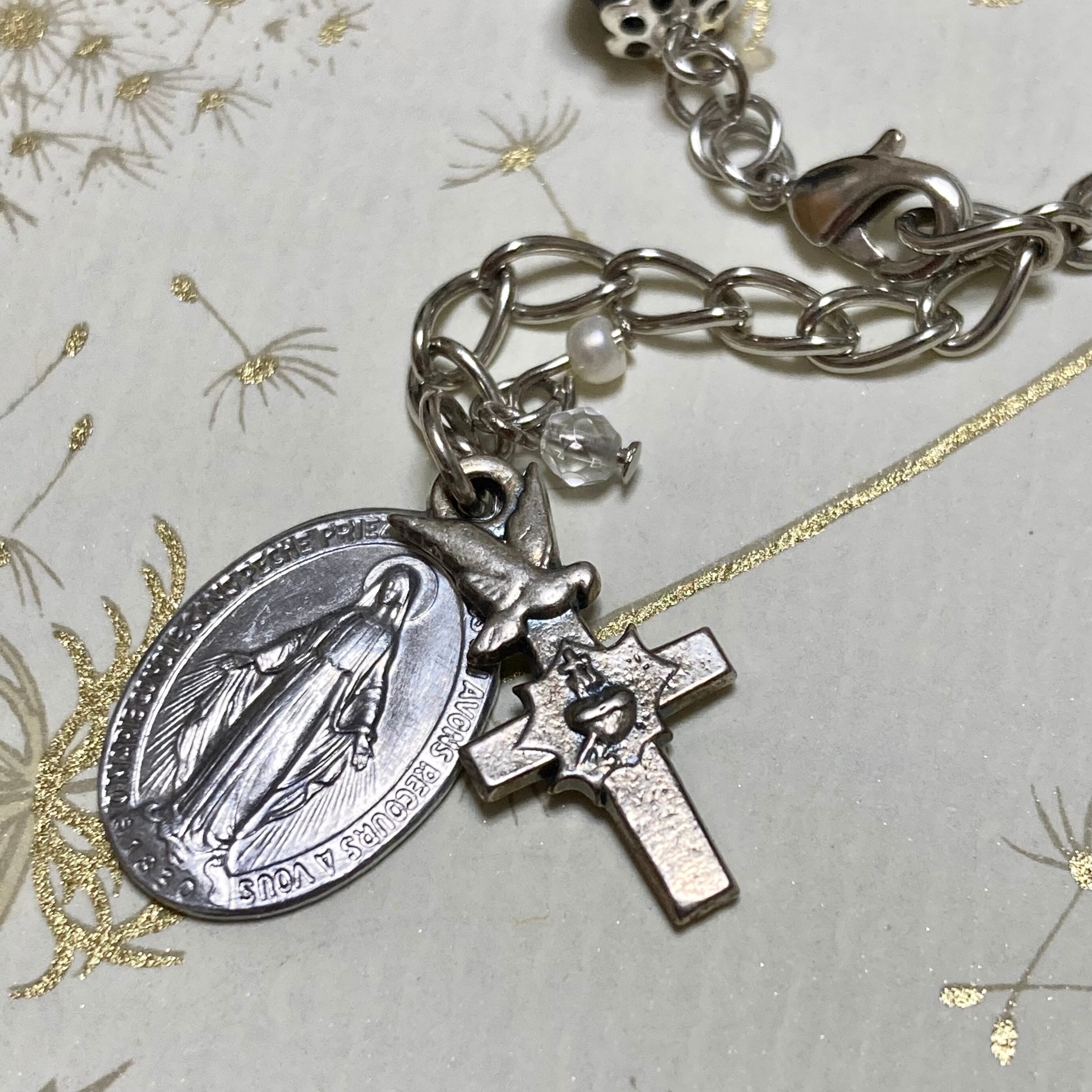 メダイは有名な不思議のメダイのデザインにも使われている聖母マリア。クロスは精霊の象徴である鳩と聖心と御心が合わさったようなデザインのクロスになります。